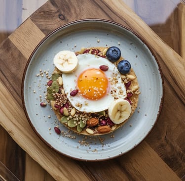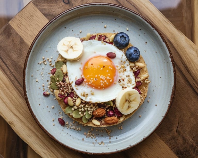 Sirve el huevo sobre las tostadas, añade la fruta en rodajas y espolvorea los frutos secos.