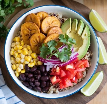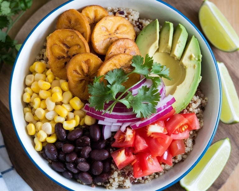 Este bowl celebra ingredientes que han viajado por siglos desde las culturas precolombinas hasta las mesas actuales. Además, es un plato versátil y aprovechable, perfecto para reutilizar granos cocidos, legumbres o plátanos que ya estén muy maduros.