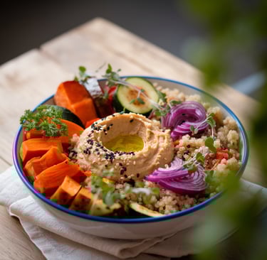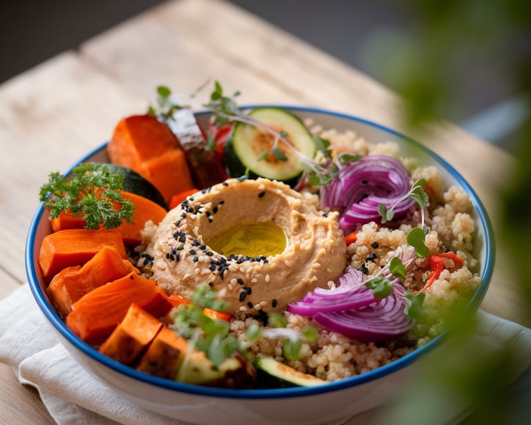 🥕 Receta Saludable: Bowl de quinoa con verduras asadas y hummus