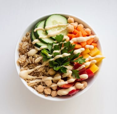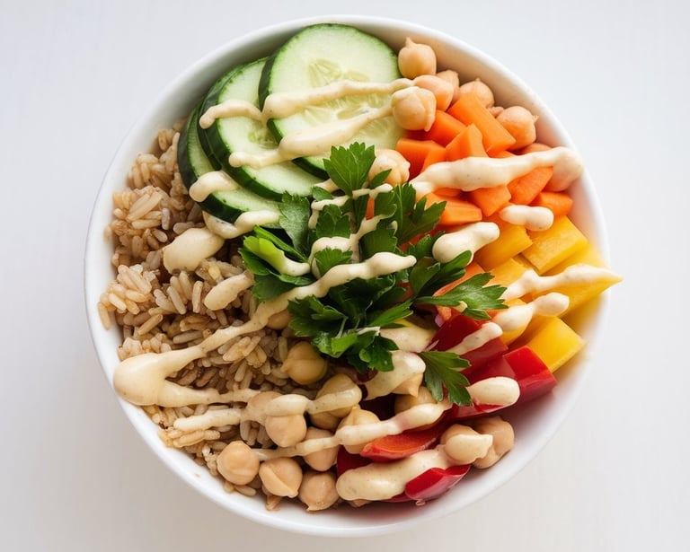 "Bowl fresco de legumbres y arroz con aliño de limón y perejil"