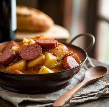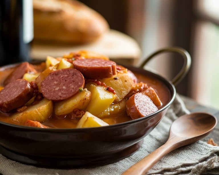 Un plato humilde y contundente, típico de la cocina riojana rural, con chorizo, patatas y pimiento.